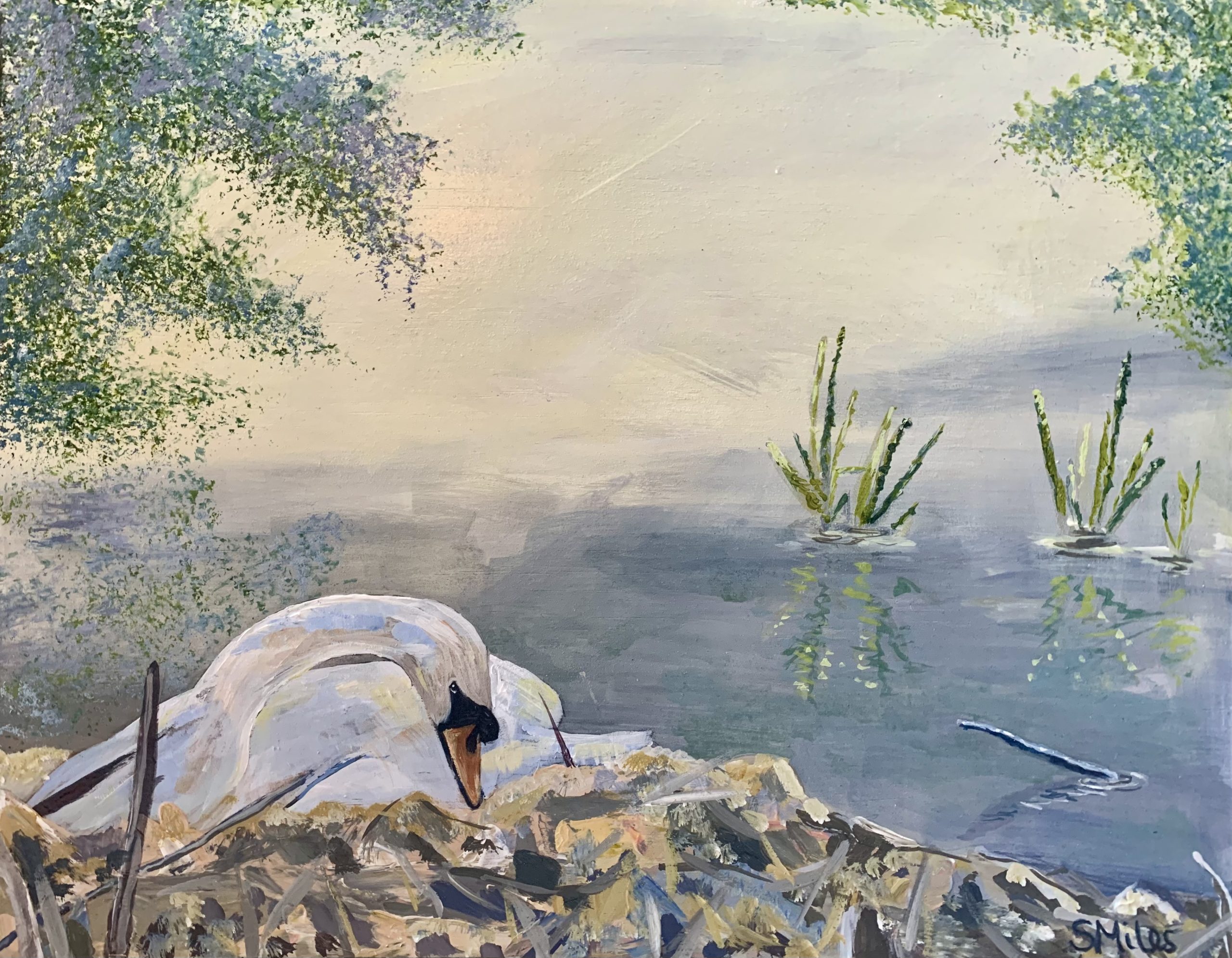 Swan on its nest at Ninesprings, Yeovil, Somerset.