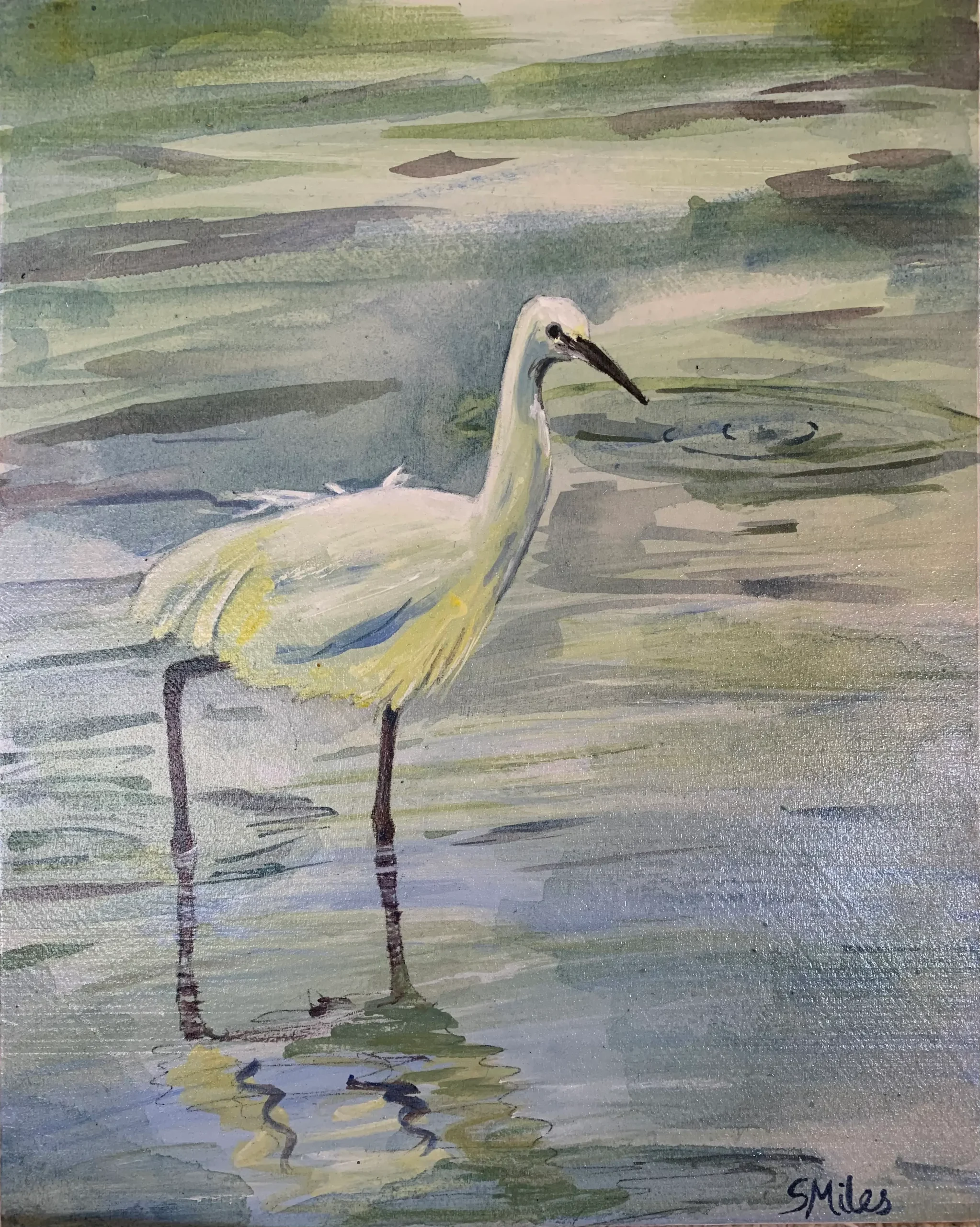 This is painted with thin translucent layers of acrylic paint to depict the water behind, whilst the egret in the foreground is opaque.